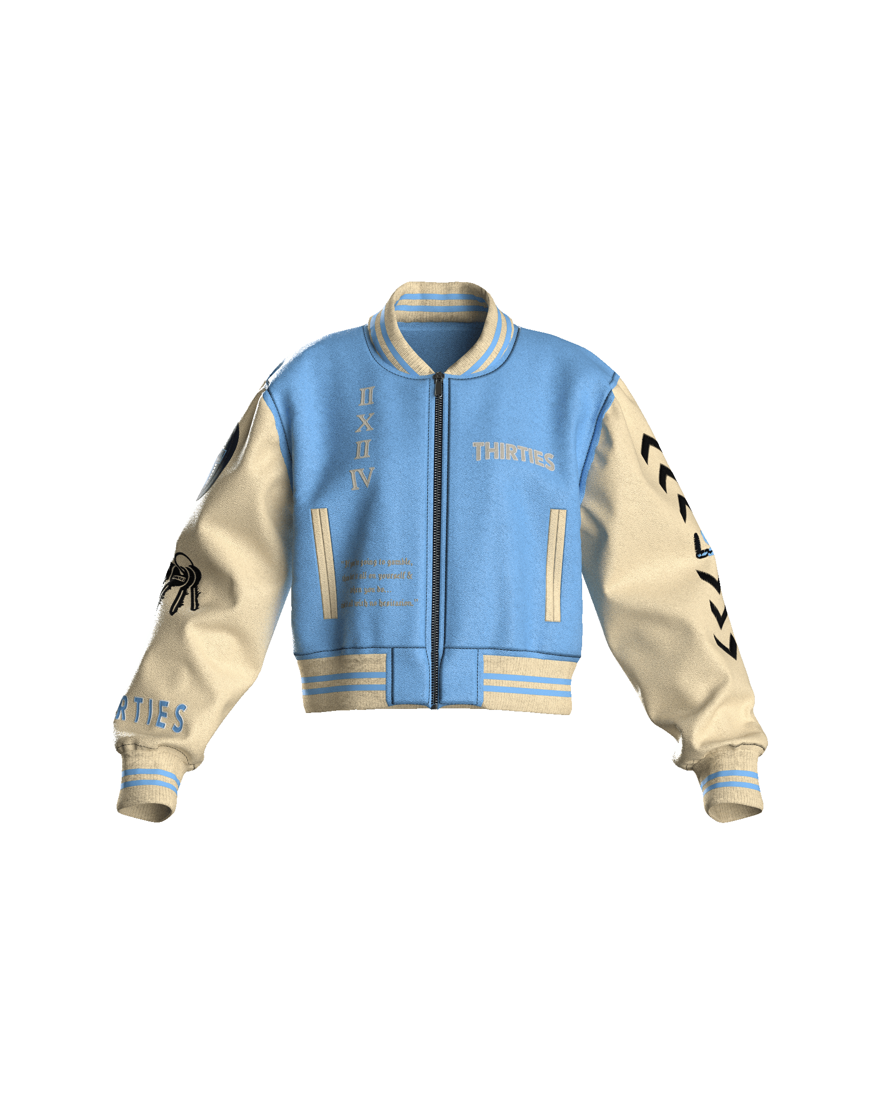 100% Leather cropped varsity jacket featuring multiple logos on the bone sleeves, branded logo on the reverse, and hand stitched front.