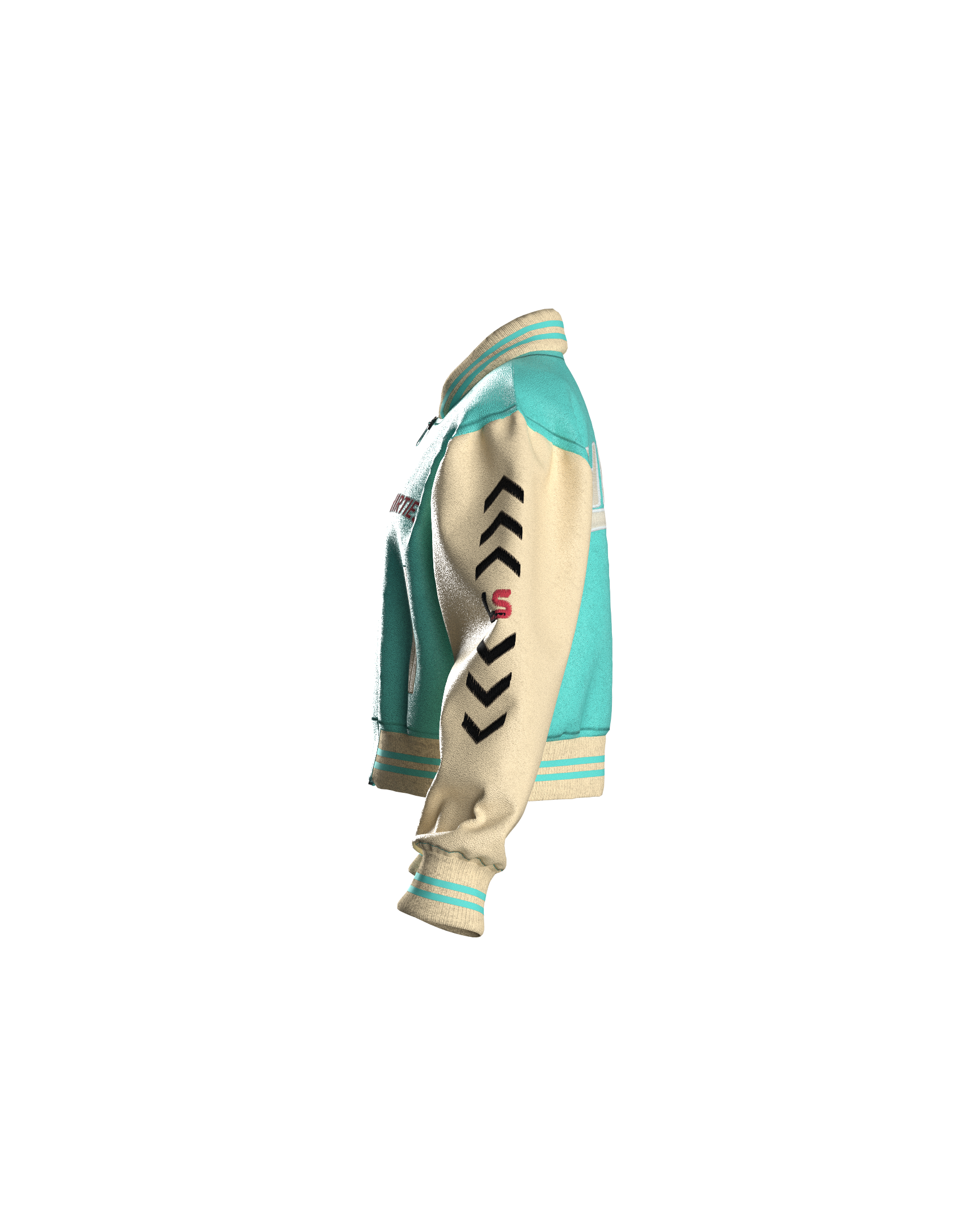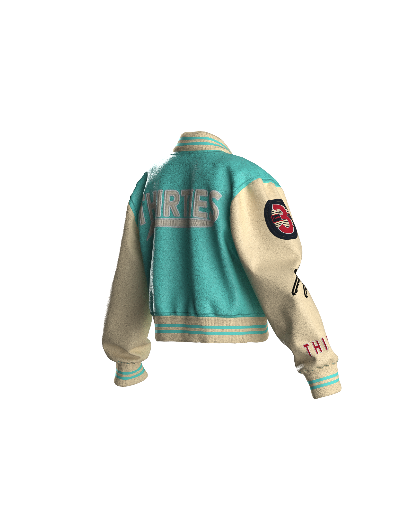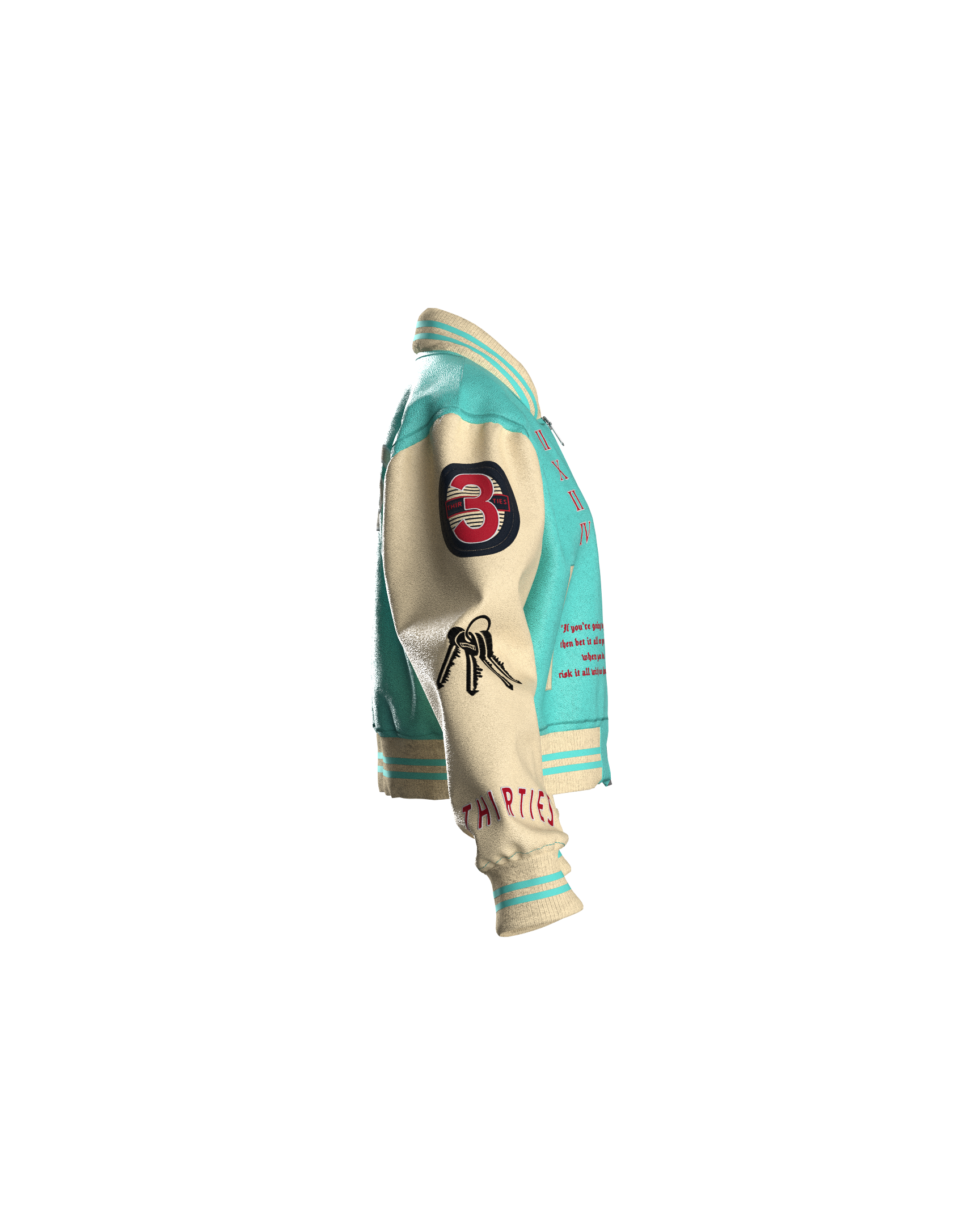 100% Leather cropped varsity jacket featuring multiple logos on the bone sleeves, branded logo on the reverse, and hand stitched front.